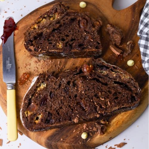 This chocolate cherry sourdough bread is made with rich cocoa powder, loads of chocolate chips and sweet glace cherries to create an indulgent loaf of sourdough bread that you can enjoy at any time of day! While this really does lean towards a dessert style bread, there’s no rule saying you can’t serve it for breakfast!