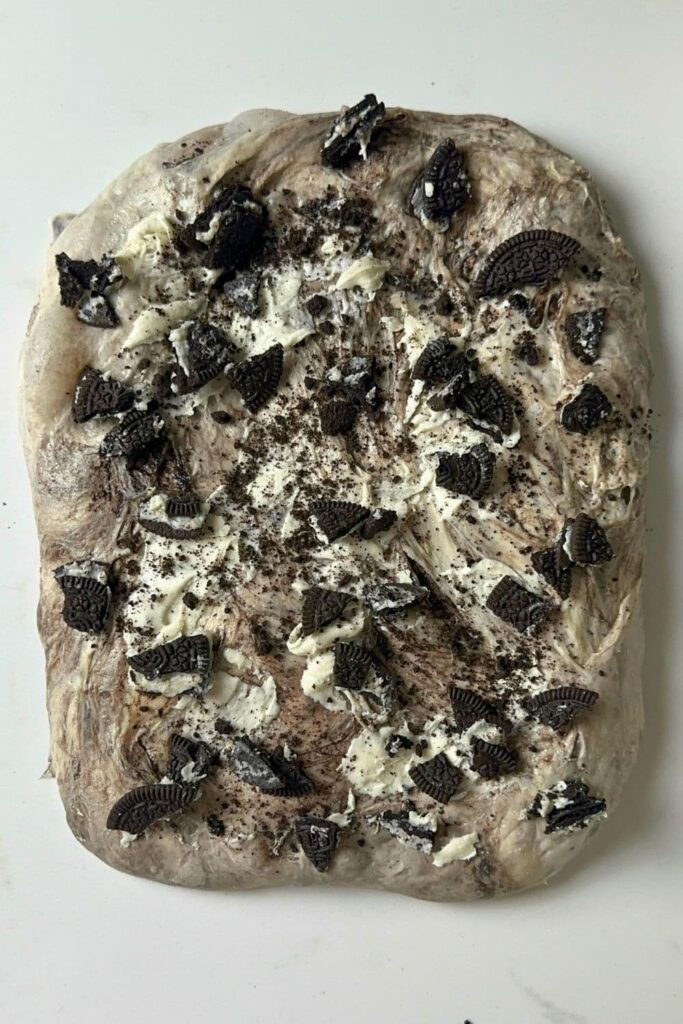 Stretch your dough out into a rough rectangle and spread it with some of the Oreo cream. Sprinkle over some crushed cookies and some Oreo pieces. Fold the top down and repeat the process. Tuck the sides in and repeat the process until you’ve used up all of the Oreo cream, crumbs and pieces.