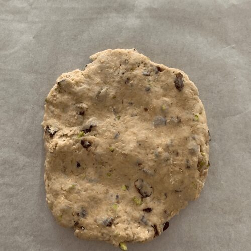 - Add sourdough discard, flour, butter, maple syrup, pistachios, cranberries, spices (and salt if adding) to a mixing bowl and bring the ingredients together to form a shaggy dough.