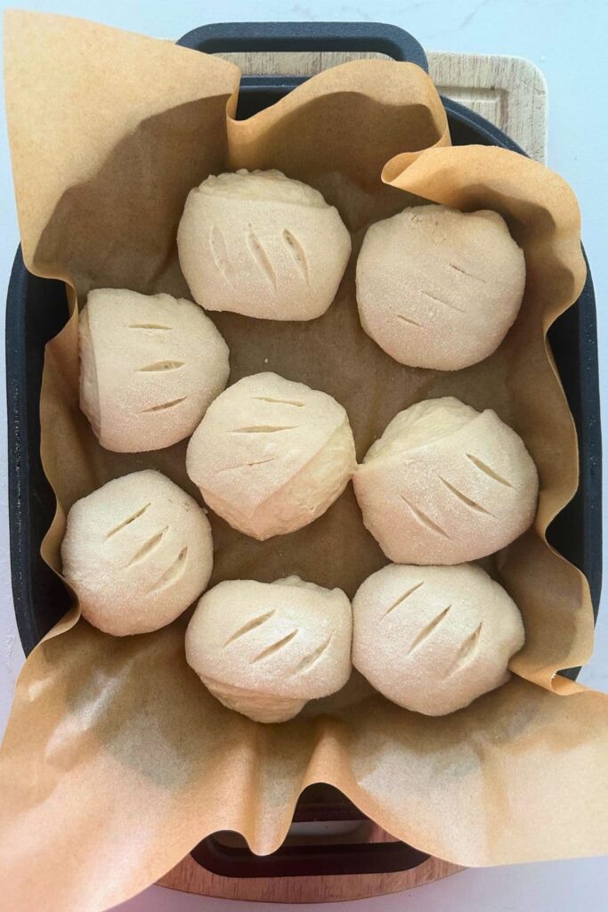 Cast Iron Bread Pan – take the hot bread pan out of the oven and gently lower the rolls in using the parchment paper. Place the lid securely on top and place into the oven. Bake for 30 minutes with the lid on at 230C/450F plus 10-15 Minutes with the lid off at 210C/410F.