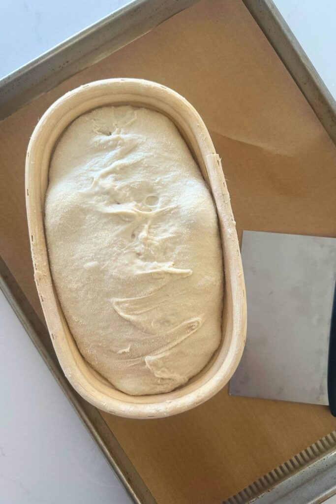 Once your dough has finished it’s first ferment, it’s time to shape it into a batard.You will need a banneton to put your dough into.