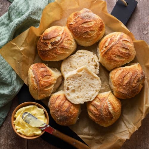 You can make them in the Thermomix, but there really isn’t a need here because this is a regular sourdough loaf that has been cut into the rolls after shaping and cold fermentation. I feel that it’s easier to mix a basic sourdough bread recipe by hand as it’s too wet for the Thermomix. If you’re wanting to make some delicious sourdough rolls in the Thermomix, I recommend these sourdough dinner rolls or these sourdough discard rolls 🙂