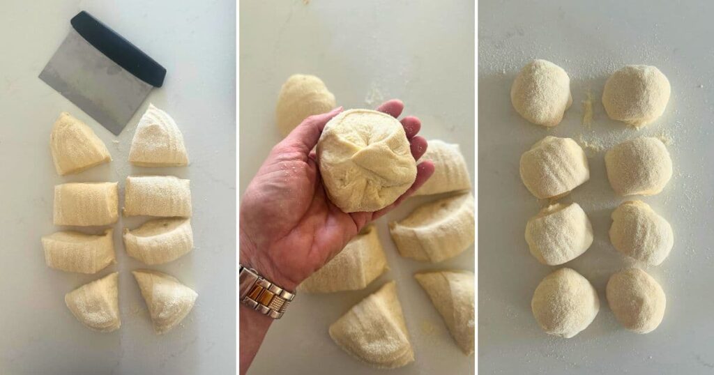 - Cutting the RollsWhen your oven is at temperature, take your sourdough batard out of the fridge. Tip the dough out of the banneton, straight out onto a clean work surface. Working quickly, cut the batard in 2 length ways using a dough scraper, and then cut each half into 4 small pieces. Gently tuck the dough under each piece, forming them into rough rounds and place them on a sheet of baking paper with a little space between each one. Just be really gentle and shape them without actually squashing them – you want to preserve as many of those precious gas bubbles as possible.