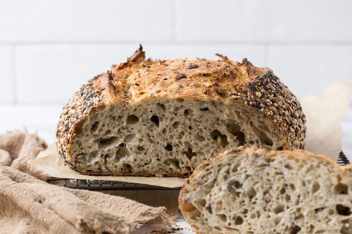Filled to the brim with grainy goodness, this easy multigrain sourdough bread recipe is everything you want in grainy bread. It’s totally customisable so you can add the seeds and whole grains you love to eat, you can even add whole wheat flour if you prefer it. There really is something so wholesome about multigrain bread. Perhaps something we didn’t love as kids, becomes somewhat of an adult treat. The smell of this hearty loaf baking is just out of this world!