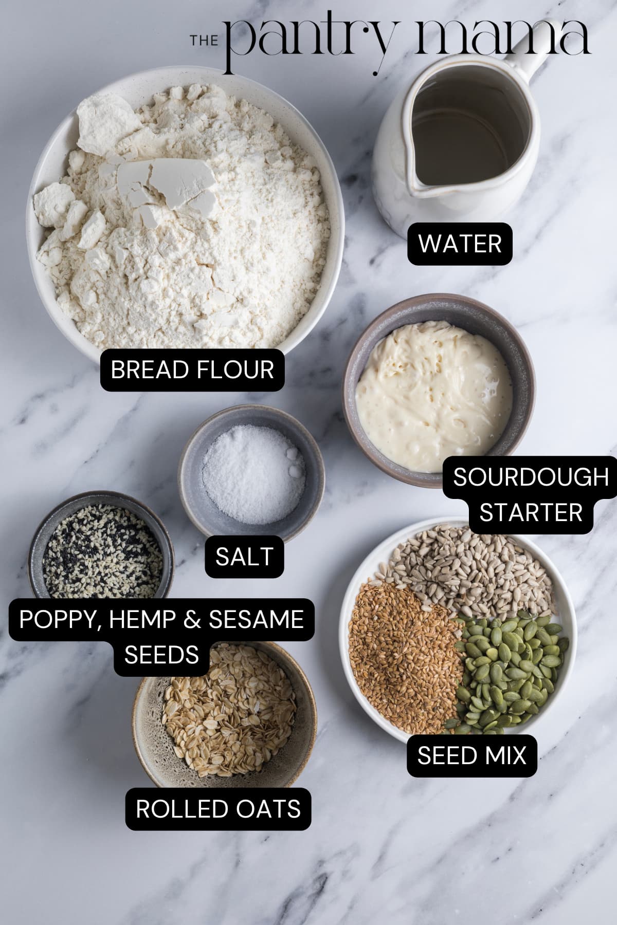 - Loads of Grains – Multigrain bread can be defined as bread made with 2 or more types of grain (source). This means that you really only need 2 types of grains (for example you could use wheat flour and rolled oats), however most breads using the “multigrain” title will contain more than 2 grains and also include some seeds as well.The sourdough multigrain bread in this recipe could be classified as more of a seeded multigrain sourdough bread due to the inclusion of seeds.