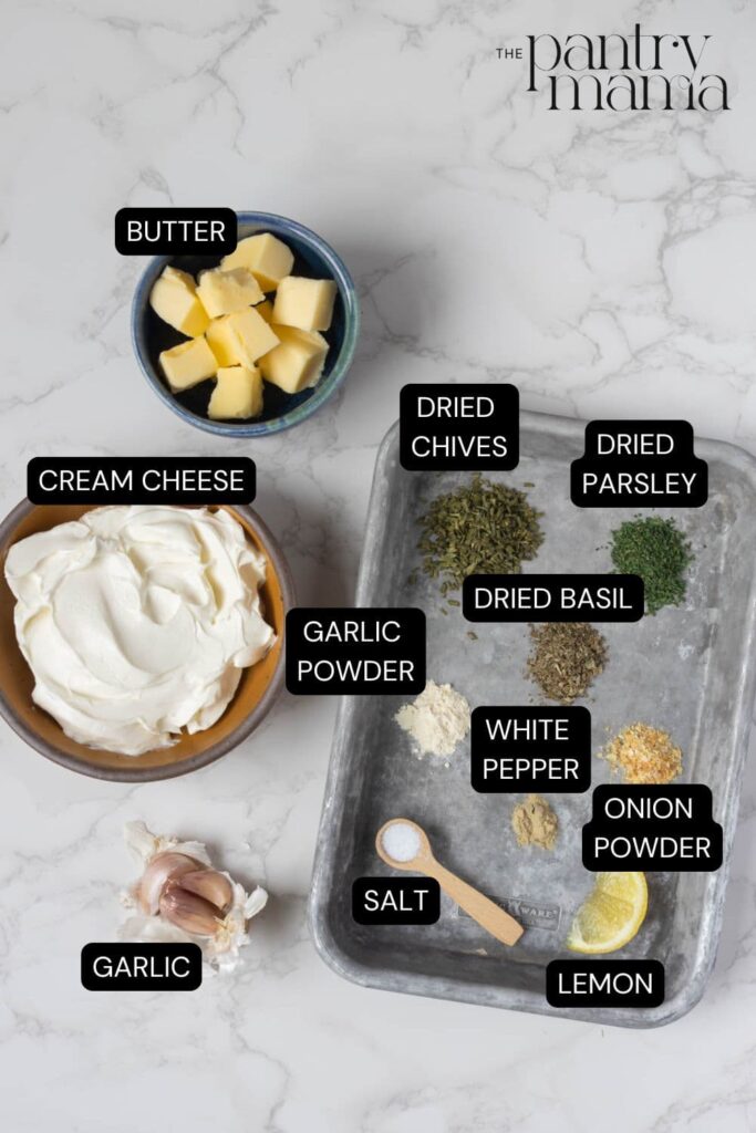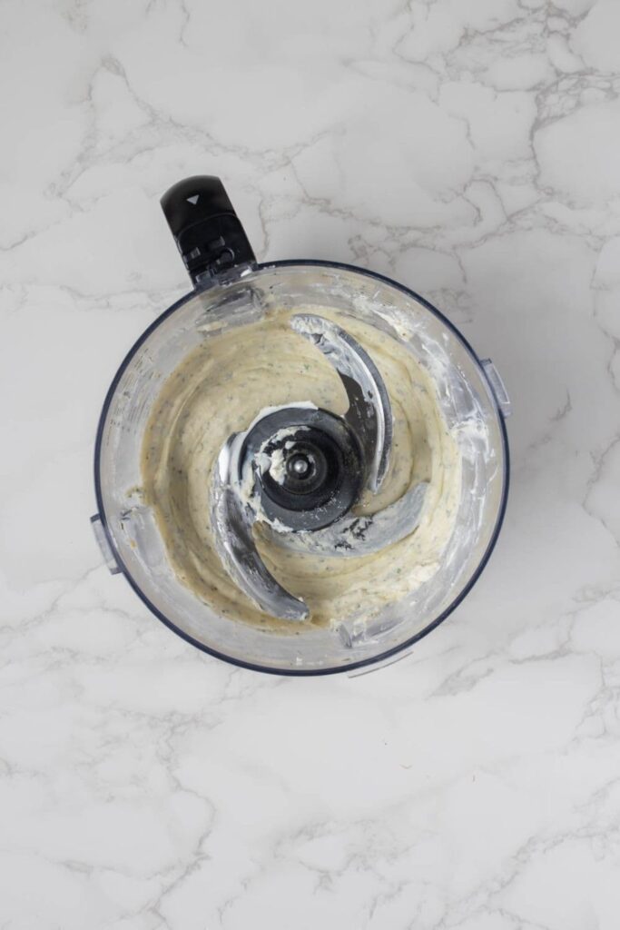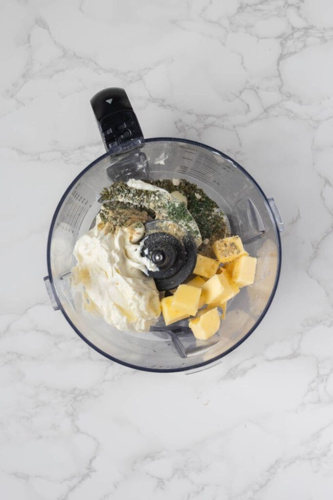 - Put the cream cheese, butter, garlic clove, chives, parsley, basil, garlic powder, onion powder, and white pepper into the bowl of a food processor. Squeeze in a bit of lemon juice and puree on high speed.