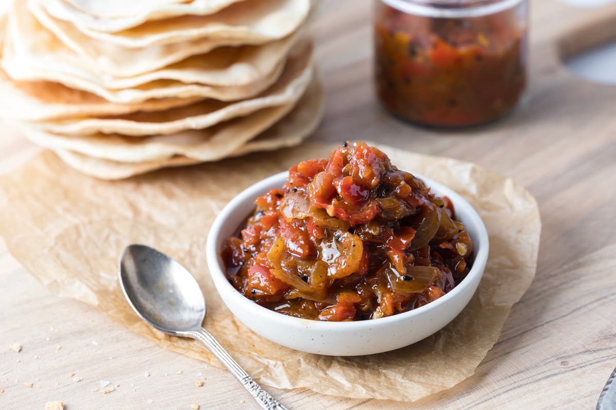I love that it’s thick with lots of texture still left in it. The smoky paprika and cumin make it feel a little different than a classic tomato chutney, and it pairs especially well with cheese. I usually serve it with a slice of simple sourdough bread or sourdough parchment crackers and a wedge of brie when people come over.