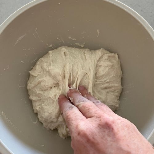 - After the dough has been through autolyse you need to bring it together into a ball. Work your way around the bowl, grabbing the dough from the outside, stretching it up and over itself, into the centre. You should feel the dough strengthen as you do this. It doesn’t have to be perfectly smooth or tight, just work around the bowl stretching and folding (around 10 – 15 times is perfect).