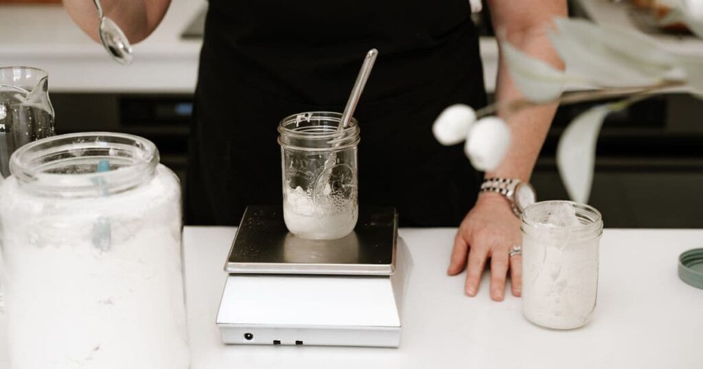 - A clean jar with a lid – I recommend a glass jar with a plastic lid. You’ll find my recommendations for the best sourdough starter jar here.