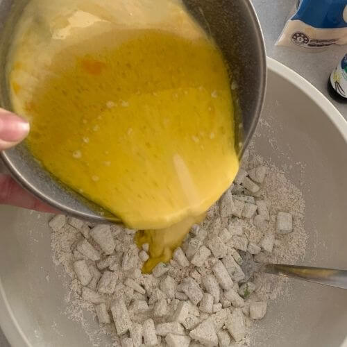 - Now pour the liquid ingredients into the dry ingredients.