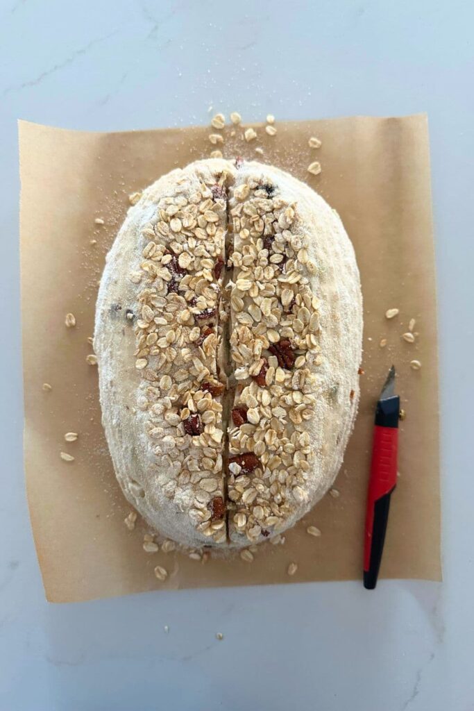 I like to sprinkle some rolled oats into my banneton before I place the dough on top so that they stick to the top of the dough.