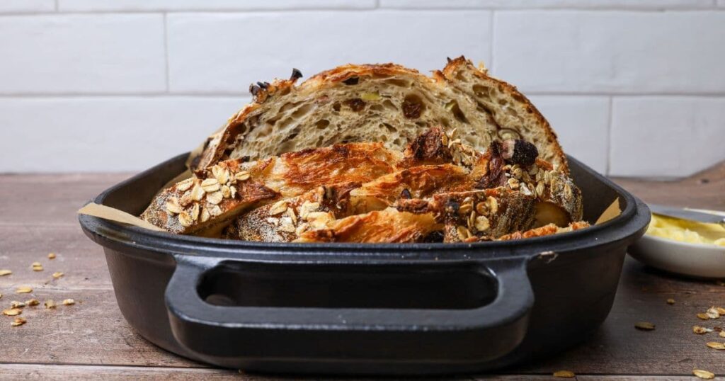 - Notes on Baking – If you’re worried about the base of your bread burning, place a baking sheet on shelf underneath your Dutch Oven – it works! If you’re worried about your bread not being cooked all the way through, turn the oven off and place your dough straight onto the oven rack. Leave the door ajar and let your bread rest there for a few hours. Remember not to cut into your loaf too soon – you’ll need to let it cool for at least a few hours (4-6 is best).