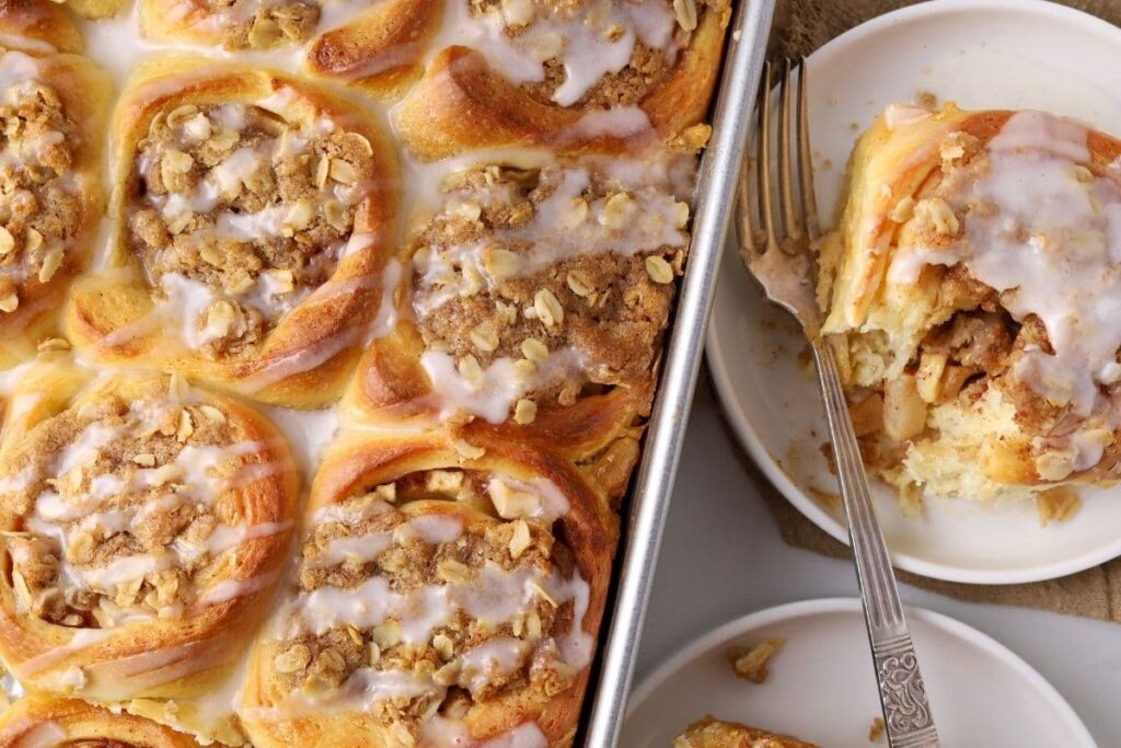 These sourdough apple cinnamon rolls are soft, fluffy, and filled with juicy green apples, buttery cinnamon sugar, and a gooey caramel base created by pouring cream into the pan before baking. Each roll is topped with a crisp oat streusel and finished with sweet vanilla glaze, giving you the perfect mix of tender dough, crunchy topping, and bubbling caramel.