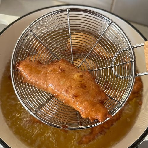 - Make sure you have a metal scoop that will allow you to remove the cooked fritters. You don’t want to use plastic. I love this metal net scoop set (it’s great for bagels too!).