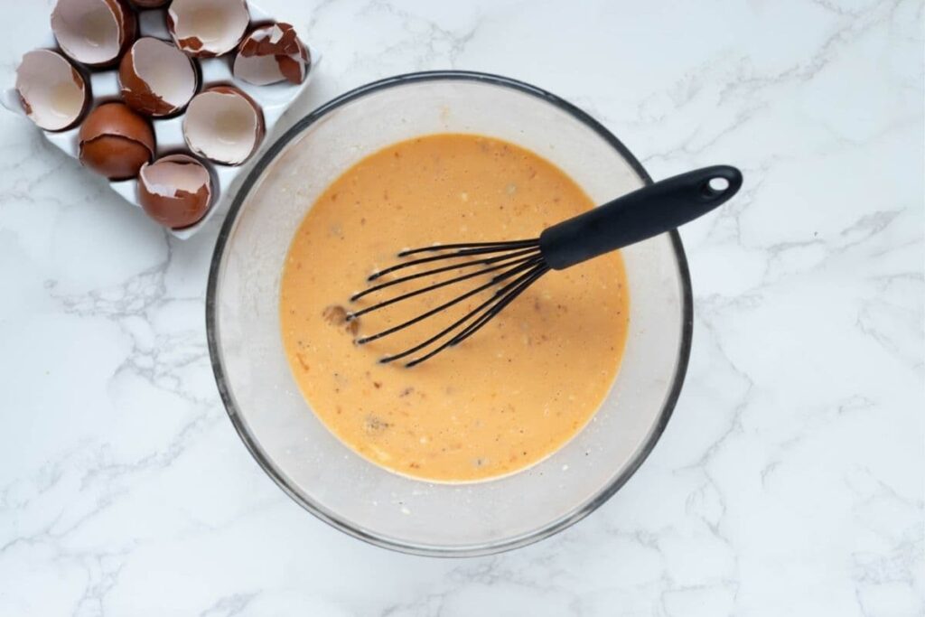 - In a batter jug, add 12 eggs, sourdough starter, salt, pepper, milk and shredded cheddar cheese (I've add a little extra Italian seasoning here too). Whisk vigorously until the ingredients are well combined.
