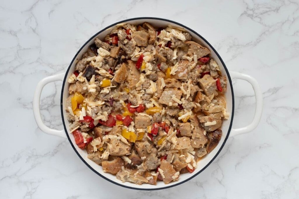 - Once the sausage and vegetable mixture is cooked through, carefully tip it over the sourdough bread cubes and spread it out evenly. Set this aside while you make the egg mixture.