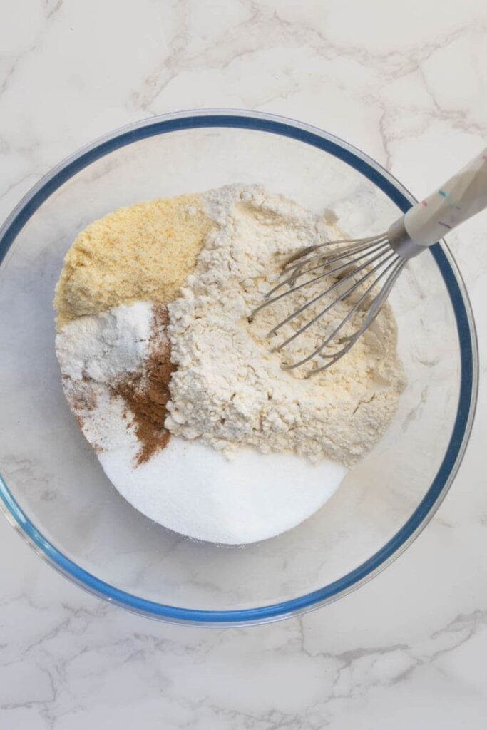 - In a separate bowl mix together all purpose flour, almond meal, salt, baking powder, cinnamon, nutmeg and sugar.