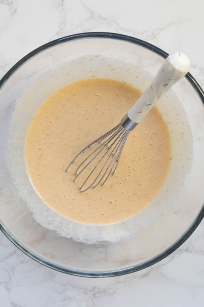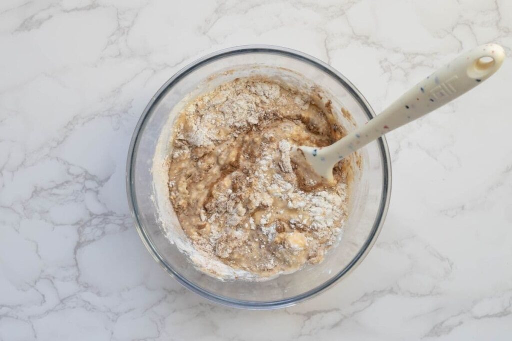 - Mix the sourdough starter, 2 eggs, milk, vanilla extract and oil in a bowl. Whisk together until well combined. It's ok if the oil sits on the top, it will combine once it is poured into the dry ingredients.