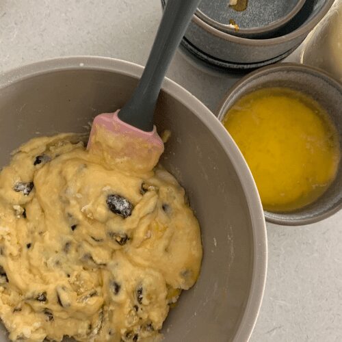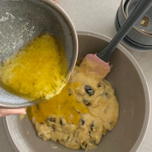 - Add the melted butter and stir into a thick batter.