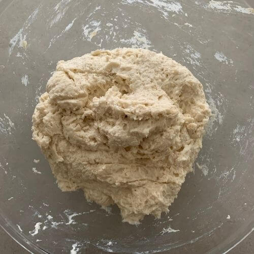 - Use wet hands or a dough scraper to gently knead the dough in the bowl. It will be sticky because of the hydration level, but it will form a dough.