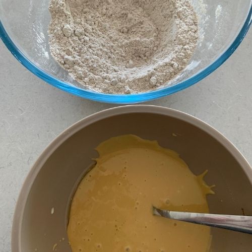 - In a separate bowl mix together all purpose flour, spices, salt, baking powder and sugar.