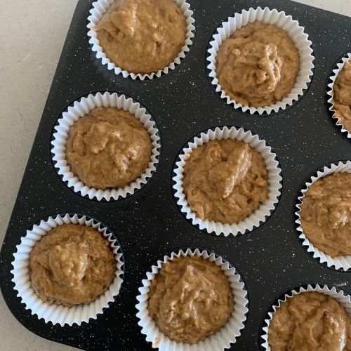 - Spoon the muffin batter into a greased 12 hole muffin tin.