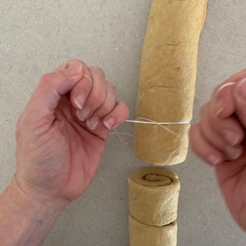 - Use dental floss to cut the rolls. Seriously! It works! Use a ruler/dough scraper to measure where you want to cut each of the rolls and then pop the dental floss under the log and use it to cut through each roll for perfect cuts every single time! It will stop you squashing the delicate rolls by trying to cut them with a knife.