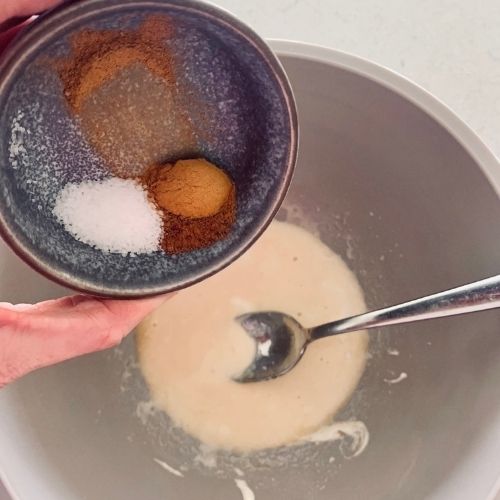 - Once the liquid ingredients are smooth, add the oats, nuts and spices. Stir the ingredients until everything is well coated with the sourdough starter mixture.