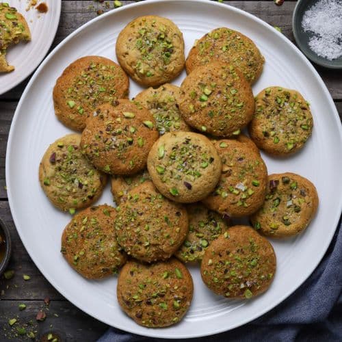 These sourdough honey pistachio cookies are best stored in a cookie tin or glass jar. Storing in plastic will make them too soft and you’ll lose the crispy edges. They will last for up to 5 days stored in a cookie tin or jar on the counter.