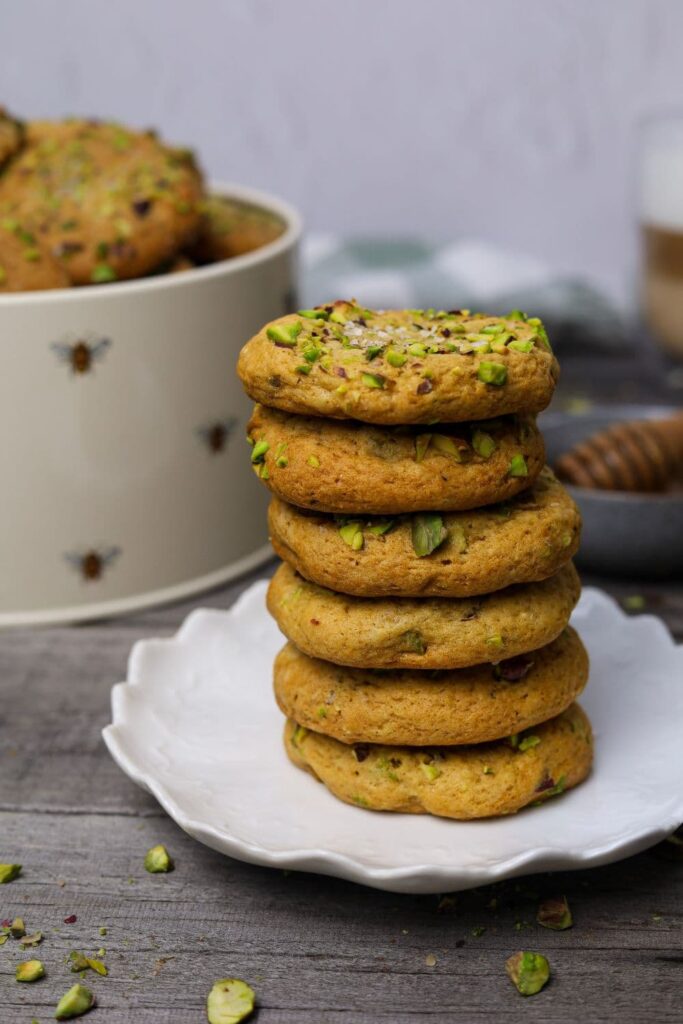 This simple one bowl recipe has been created using the tried and tested recipe for my sourdough chocolate chip cookies as a basis. Of course, it has been changed to incorporate the delicious flavors of honey and pistachio, which means that the amounts of sugar have been reduced to accomodate this.