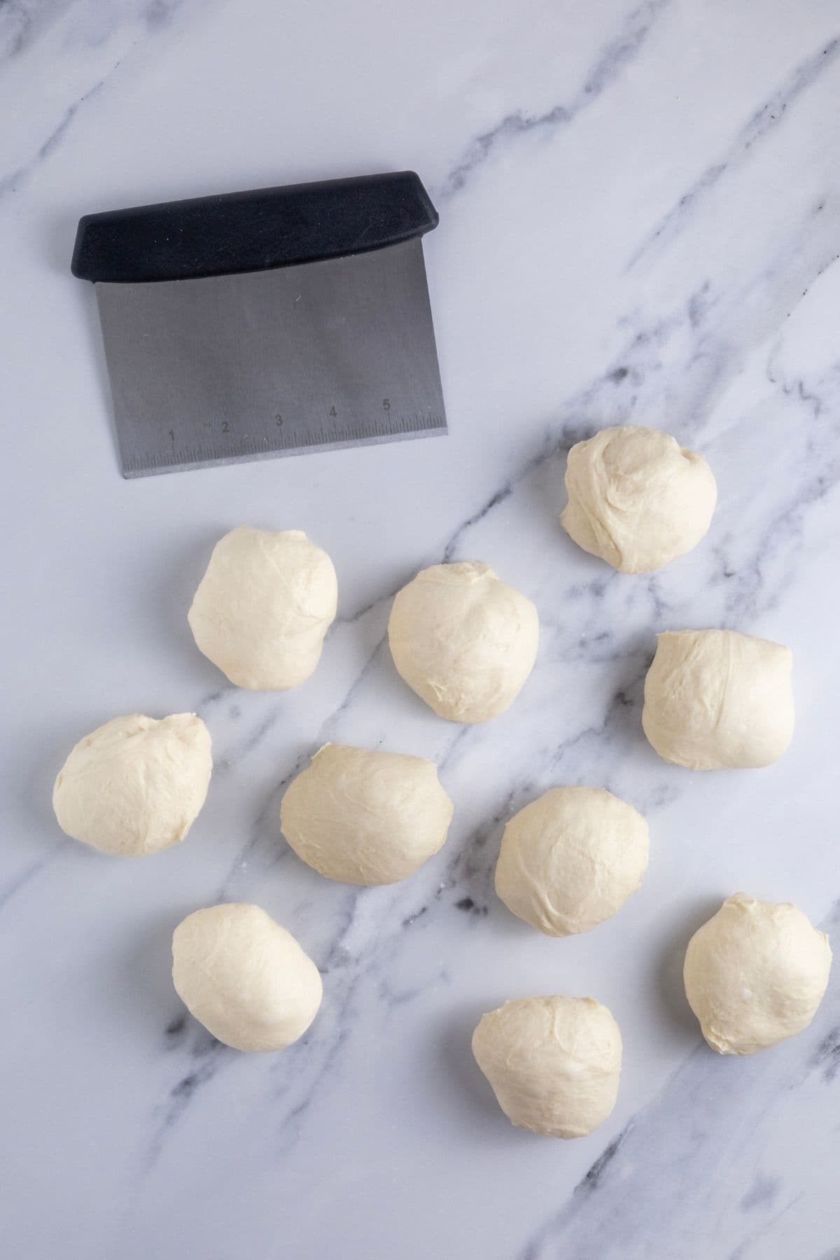 - Once the dough has risen turn it out onto the counter and divide it into 10 equally weighted pieces. I make mine around 95g each.