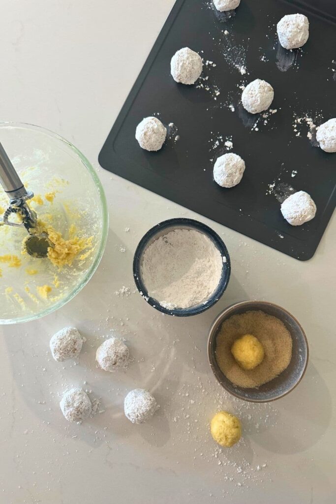 The cookie dough freezes really well. Once they’ve been rolled in powdered sugar, snap freeze them on a baking tray before transferring them to a freezer safe zip top bag.
