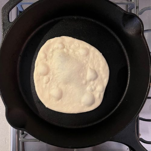 Yummy! I had a lot of trouble with burny spots. I rolled it to about 4mm thick but it was barely cooked in the middle while burned on the outside after about 25 seconds. Kind of like yours but bigger blacker spots. Carbon all over the place. Was it cause I was using a steel pan? Or hadn’t let the dough rise or rest enough to flatten more? Tasty flavor though! Thanks for the recipe.