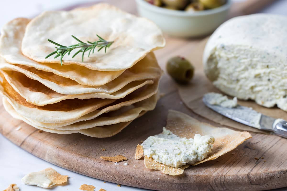 These sourdough parchment crackers are perfect for grazing boards and cheese platters. I love serving them with soft cheeses like Brie or Camembert and a spoonful of red pepper relish or tomato chutney. They’re superb with homemade Boursin cheese (which you can see pictured in these photos).
