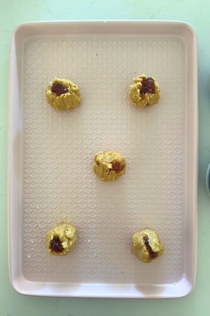 Add a small scoop of peanut butter and jelly to the centre of each ball and then gently pull up the edges. You don’t have to close the balls, a little bit of the peanut butter and jelly should be poking out the top. They definitely don’t have to be perfect!