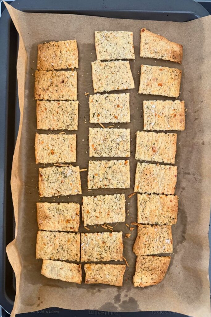 - Bake at 350F/170C for around 30 minutes or until crackers are golden and crisp. You might need to flip the crackers half way through baking to ensure they crisp up evenly. I also break mine into individual pieces around half way through baking time to help them cook through properly.
