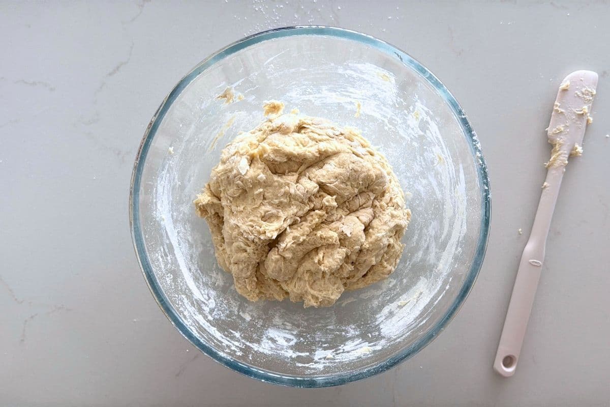- Use a wooden chopstick or end of a wooden spoon to gently bring all the ingredients together into a shaggy dough. You don't need to it be fully smooth, just ensure that all of the flour is wet.