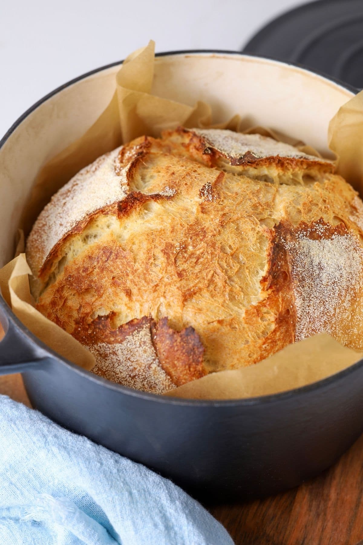 Carefully lift the dough using the parchment paper and place it into the hot Dutch oven (we don’t actually need any further proofing once the dough is shaped).