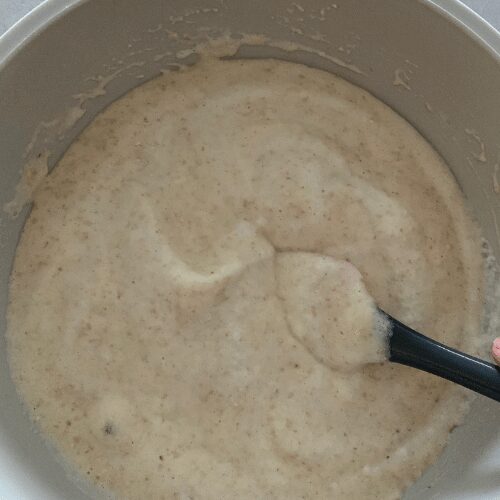 - Now add sourdough starter, whole wheat flour, pulverised rolled oats, mashed banana, salt and milk to the egg mixture and whisk until well combined and smooth.