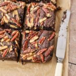 Now, in a separate bowl, combine the pecans, melted butter and brown sugar, ensuring the pecans are well coated. Spread the pecan mixture out over the top of the spiced sourdough brownie batter, gently pushing them in to ensure they bake into the batter.