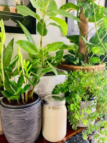 • Kate from The Pantry Mama in the kitchen feeding her sourdough starter at the kitchen counter. She is using a kitchen scale to measure water from a jug into a mason jar. There is a jar of flour on the counter in front of her.