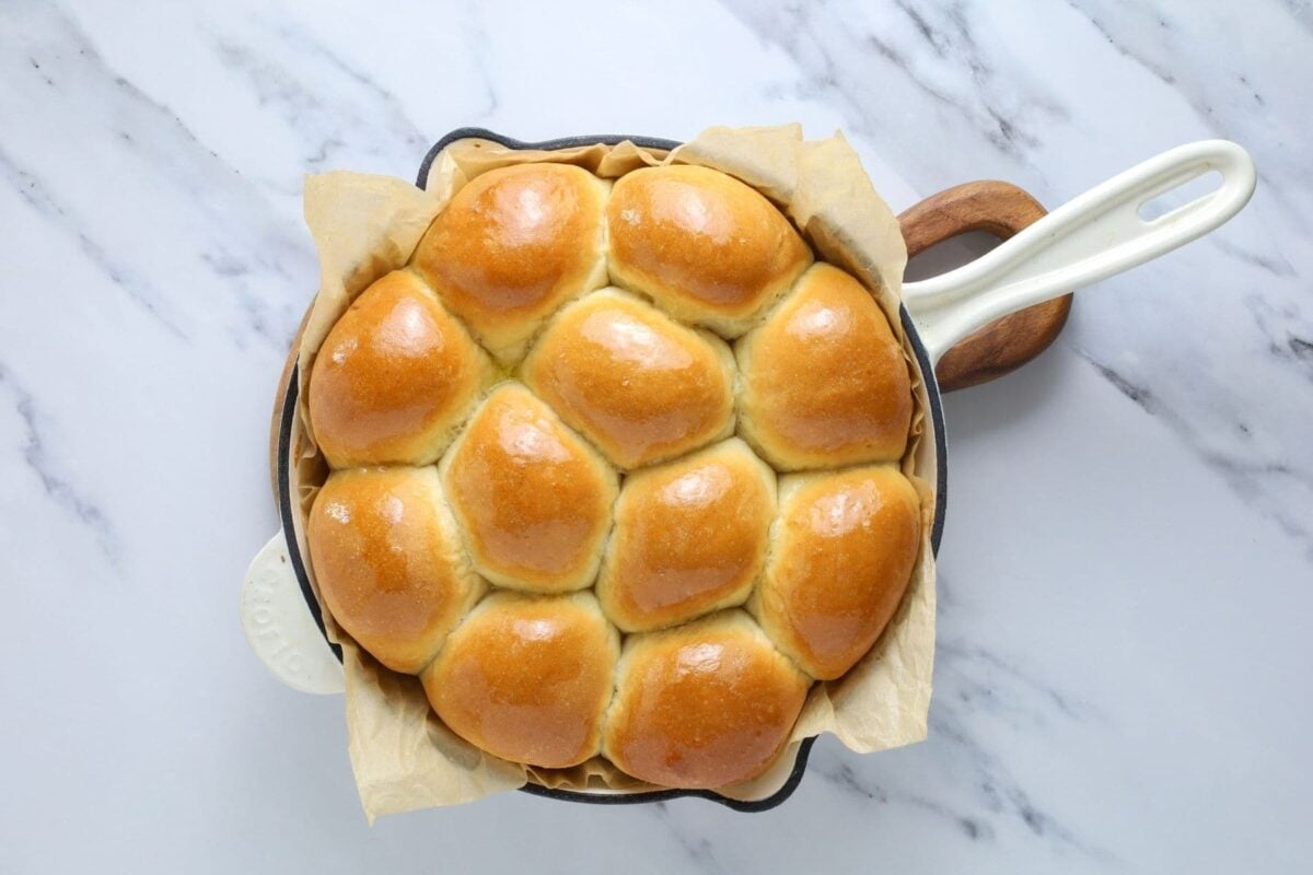 In the photos in this post, I’ve placed the rolls into a 12″ round cast iron skillet, but this recipe also works in a USA Pan Sheet Cake Pan measuring 9″ x 13″ or any baking dish or baking pan of that size. I always use parchment paper when using a skillet, but you don’t necessarily need it.
