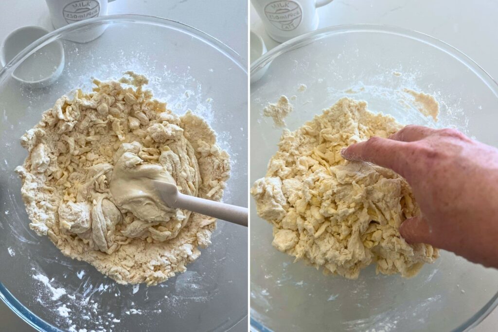 Once you pour in your sourdough starter (or discard) and vinegar, bring it together with your hands into a rough, shaggy dough, don’t worry if it looks a little dry. If it absolutely refuses to come together, a splash of cold water will do the trick.