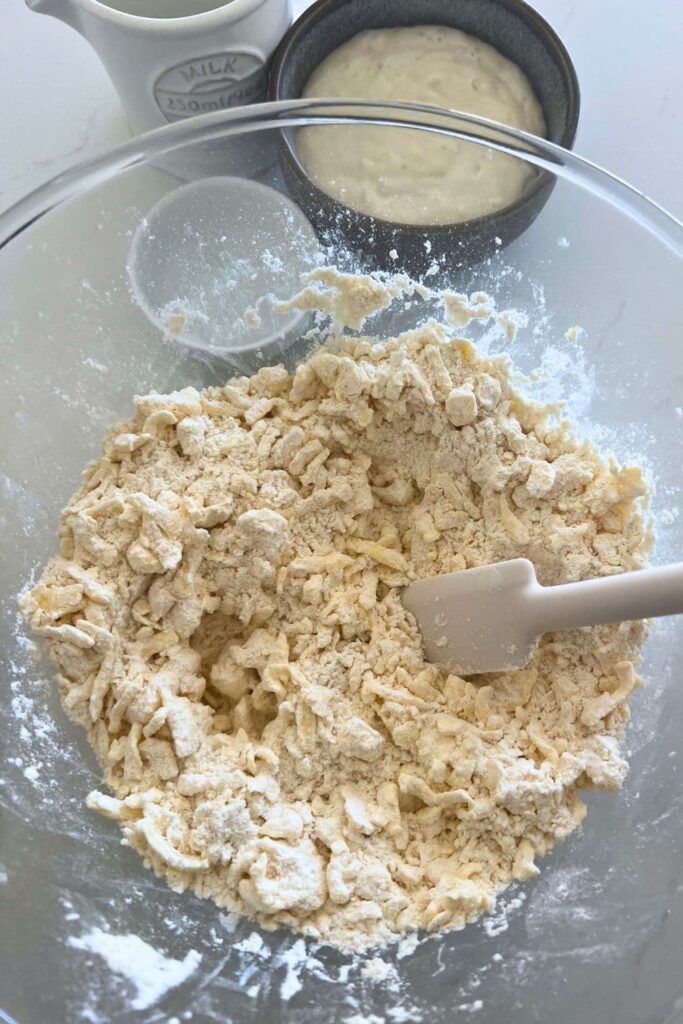 - Place the cold, grated butter into the bowl with the flour, salt and sugar and use a spatula, pastry cutter or simply your finger tips to coat the butter in the flour. You want the butter to stay cold, so try to touch it as little as you can.